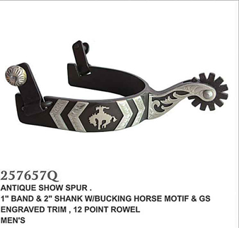 1" BAND & 2" SHANK W/BUCKING HORSE MOTIF & GS ENGRAVED TRIM, 12 POINT ROWEL. MEN'S